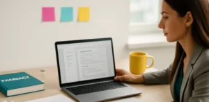 Learn pharma skills anywhere with flexible online courses. This student studies at her own pace, reviews real GMP examples, and takes notes for her next exam. Pharma technology courses like this help you stay job-ready and move faster toward a modern pharma career.