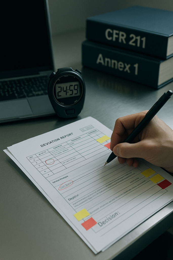 - Deviation triage: “Impact potential on potency; immediate containment executed; initiate investigation per SOP-DEV-012 within 24 hours.”