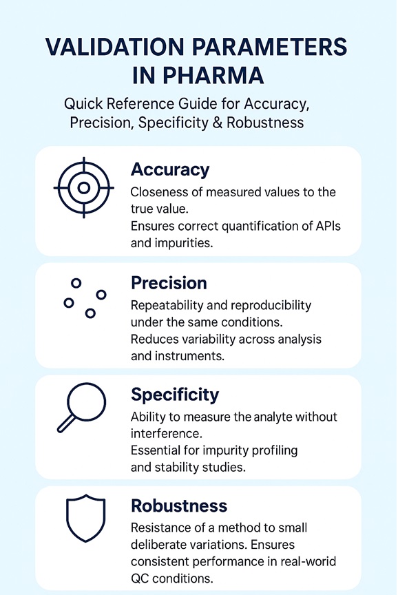A strong validation program evaluates several scientific characteristics that define how a method behaves in real laboratory conditions. These parameters ensure long-term reproducibility and protect the quality of analytical decisions.