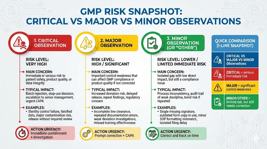 A critical observation shows a serious GMP gap with immediate patient or product risk. Auditors flag it when controls fail and contamination, mix-up, or data risks rise.