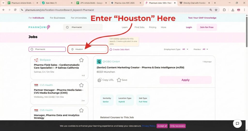 When assessing GMP and clinical research jobs in Houston, focus on your core strengths sterile manufacturing, quality systems, regulatory affairs, or clinical operations. Then review job descriptions to understand required compliance experience, FDA interactions, and responsibilities related to inspection readiness and validation.  Moreover, evaluate employer maturity, pipeline stage, and hiring patterns, because established manufacturers and research institutions often demand deeper GMP and protocol compliance knowledge than early-stage operations. To simplify your search and target roles that align with your experience and career goals, use PharmUni’s smart filters to Explore Pharma Jobs by function, employer, and compliance focus which helps you make data-driven decisions in Houston’s competitive life sciences job market.