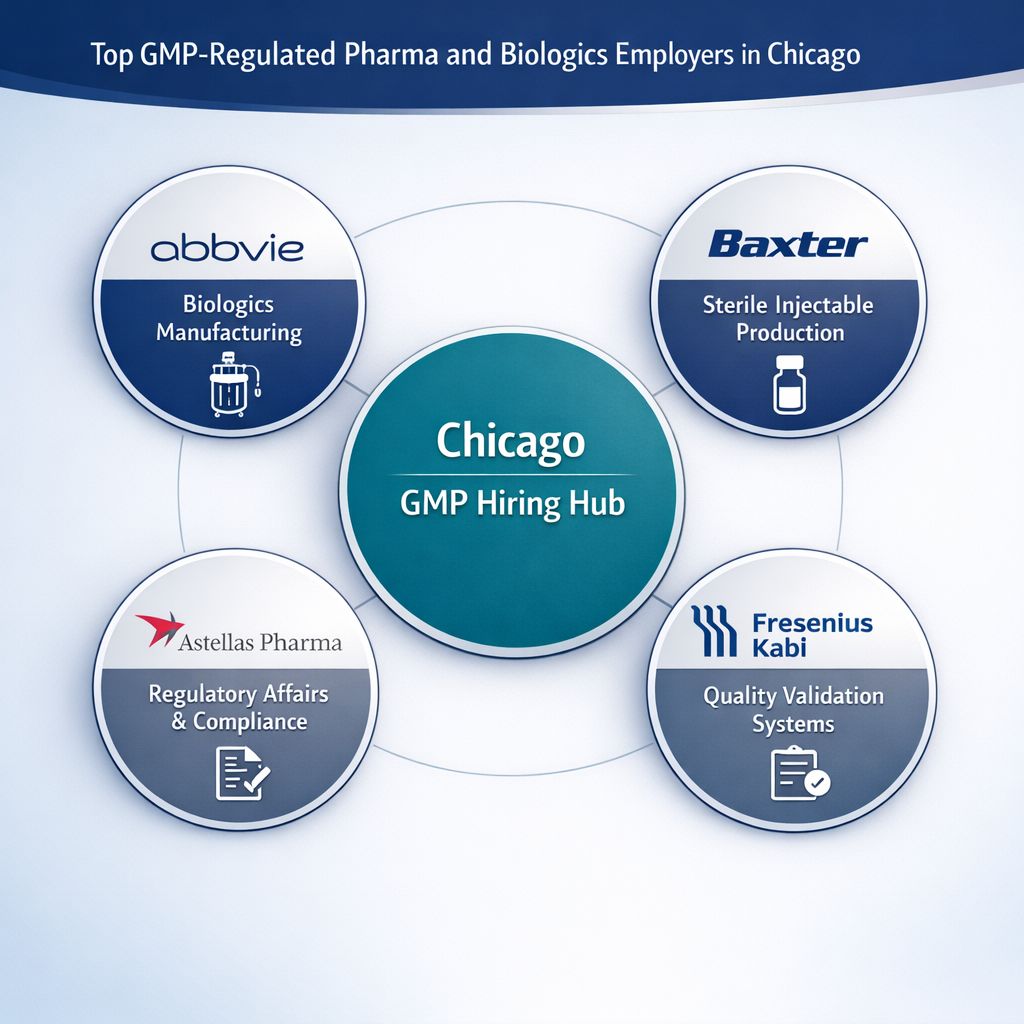 The infographic below presents the top GMP-regulated pharma and biologics employers in Chicago and highlights their primary compliance-driven hiring focus areas.