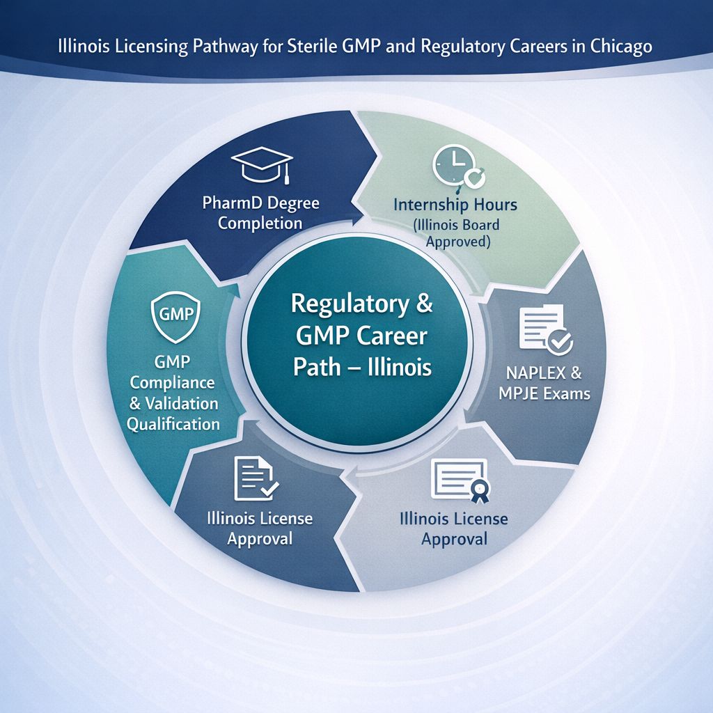 Step-by-step pathway showing pharmacist licensure steps, internship requirements, and regulatory compliance standards for careers in sterile and GMP roles in Illinois.