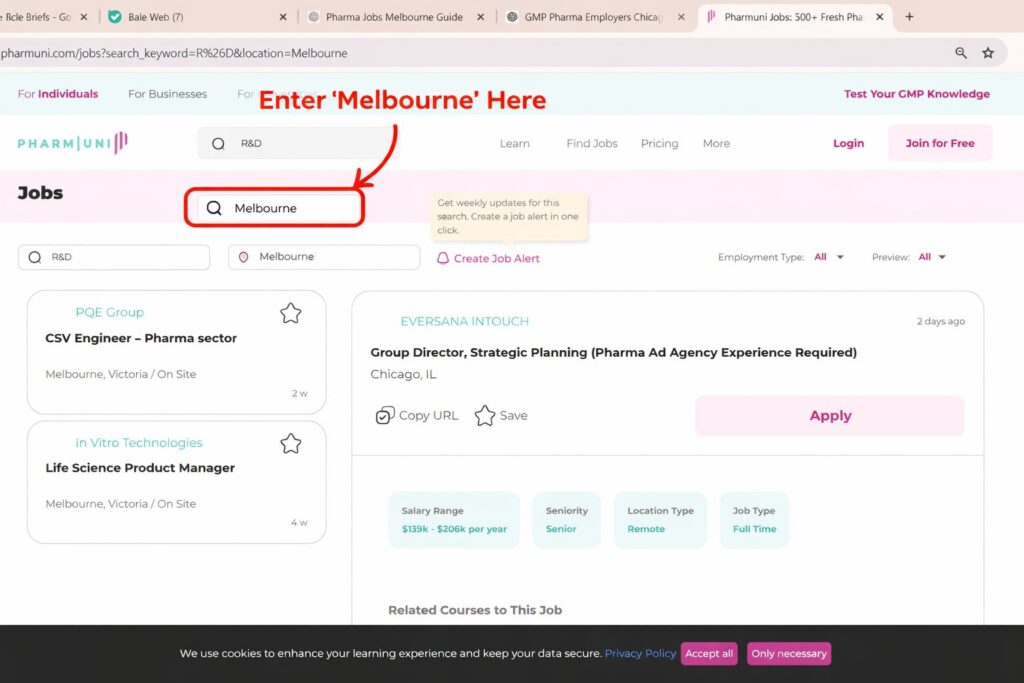 Start by visiting at Explore Pharma Jobs and use the advanced filters to narrow results by GMP exposure, sterile manufacturing focus, or regulatory affairs function. Then review each listing for TGA inspection history, batch release responsibility, and validation scope to match your compliance experience. Finally, compare roles strategically and apply to positions that align with your GMP expertise and long-term regulatory career goals.