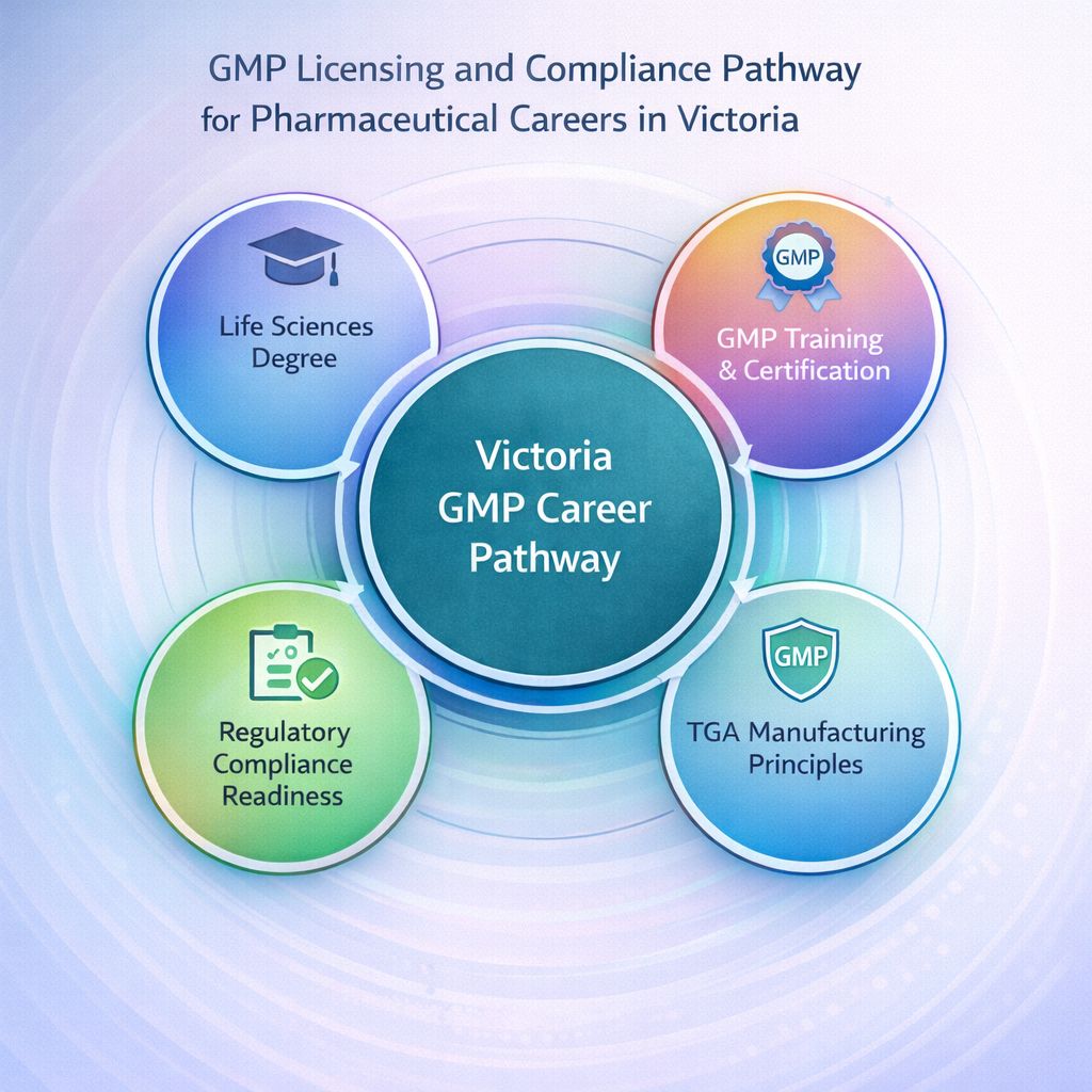 This infographic illustrates the GMP licensing and compliance pathway for professionals pursuing pharmaceutical careers in Victoria, from foundational education to regulatory qualification readiness.