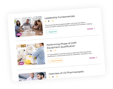Erhalten Sie sofortigen Zugriff auf jedes Pharmuni-Programm — mit Themen wie GMP, Pharmacovigilance, Qualitätsmanagement, Herstellung, Lieferkette, IT-Validation, Professional Skills und mehr — entwickelt vom ISO-9001-zertifizierten Team von Zamann Pharma Support. Ein erschwinglicher, selbstbestimmter Plan bietet unbegrenztes Lernen, Quizze und Zertifikate auf jedem Gerät.