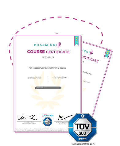 Erwerben Sie ein branchenanerkanntes Zertifikat unter Zamann’s ISO-9001-zertifiziertem System — mit einem Ein-Klick-Validierungs-Button, um Ihre GMP- oder Pharmakovigilanz-Expertise gegenüber Arbeitgebern nachzuweisen.